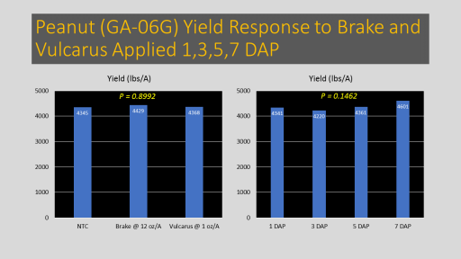 Peanut (GA-06G) Yield Response to Brake and Vulcarus Applied 1,3,5,7 DAP<BR>P = 0.8992<BR>P = 0.1462<BR>