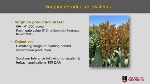 Sorghum Production Systems<BR>Sorghum production in GA: <BR>GA - 41,000 acres <BR>Farm gate value $16 million (UGA Farmgate Report 2019)  <BR> <BR>Objective: <BR>Simulating sorghum planting behind watermelon production <BR> <BR>Sorghum tolerance following fomesafen & terbacil applications 100 DAA<BR>