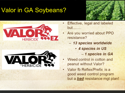 Valor in GA Soybeans?<BR>Effective, legal and labeled but……. <BR>Are you worried about PPO resistance? <BR>13 species worldwide <BR>4 species in US <BR>1 species in GA <BR>Weed control in cotton and peanut without Valor? <BR>Valor fb Reflex/Prefix is a good weed control program but a bad resistance mgt plan!<BR>