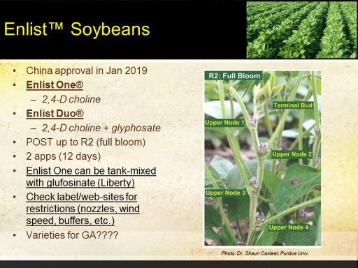 Enlist™ Soybeans<BR>China approval in Jan 2019 <BR>Enlist One®  <BR>2,4-D choline <BR>Enlist Duo® <BR>2,4-D choline + glyphosate <BR>POST up to R2 (full bloom) <BR>2 apps (12 days) <BR>Enlist One can be tank-mixed with glufosinate (Liberty) <BR>Check label/web-sites for restrictions (nozzles, wind speed, buffers, etc.) <BR>Varieties for GA???? <BR> <BR> <BR>