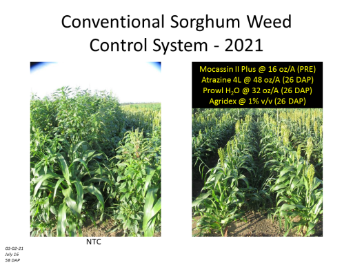 Conventional Sorghum Weed  Control System - 2021<BR>GS-02-21 <BR>July 16 <BR>58 DAP<BR>NTC<BR>Mocassin II Plus @ 16 oz/A (PRE)  <BR>Atrazine 4L @ 48 oz/A (26 DAP) <BR>Prowl H2O @ 32 oz/A (26 DAP) <BR>Agridex @ 1% v/v (26 DAP)<BR>