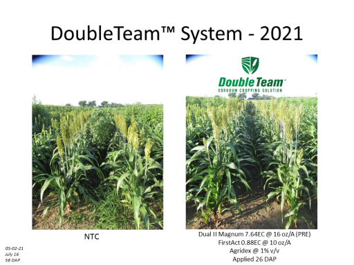 DoubleTeam™ System - 2021<BR>GS-02-21 <BR>July 16 <BR>58 DAP<BR>Dual II Magnum 7.64EC @ 16 oz/A (PRE) <BR>FirstAct 0.88EC @ 10 oz/A <BR>Agridex @ 1% v/v <BR>Applied 26 DAP<BR>NTC<BR>