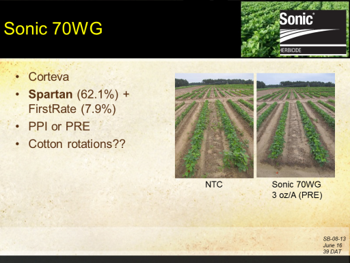 Sonic 70WG<BR>Corteva <BR>Spartan (62.1%) + FirstRate (7.9%) <BR>PPI or PRE  <BR>Cotton rotations??<BR>NTC<BR>Sonic 70WG <BR>3 oz/A (PRE) <BR>SB-08-13 <BR>June 16 <BR>39 DAT<BR>