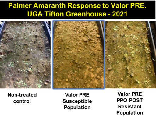 Non-treated control<BR>Valor PRE <BR>Susceptible Population<BR>Valor PRE <BR>PPO POST Resistant Population<BR>Palmer Amaranth Response to Valor PRE.  <BR>UGA Tifton Greenhouse - 2021 <BR>