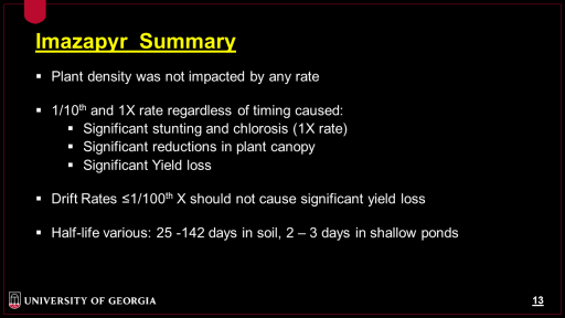 Imazapyr  Summary<BR>Plant density was not impacted by any rate <BR> <BR>1/10th and 1X rate regardless of timing caused: <BR>Significant stunting and chlorosis (1X rate) <BR>Significant reductions in plant canopy <BR>Significant Yield loss <BR> <BR>Drift Rates =1/100th X should not cause significant yield loss <BR> <BR>Half-life various: 25 -142 days in soil, 2 – 3 days in shallow ponds <BR> <BR>