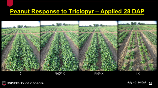 Peanut Response to Triclopyr – Applied 28 DAP<BR>July – 2; 66 DAP<BR>0<BR>1/100th X <BR>1/10th X<BR>1 X<BR>