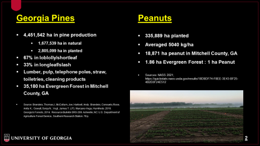 4,451,542 ha in pine production <BR>1,677,539 ha in natural <BR>2,805,099 ha in planted <BR>67% in loblolly/shortleaf <BR>33% in longleaf/slash <BR>Lumber, pulp, telephone poles, straw, toiletries, cleaning products <BR>35,180 ha Evergreen Forest in Mitchell County, GA <BR> <BR>Source: Brandeis, Thomas J.; McCollum, Joe; Hartsell, Andy; Brandeis, Consuelo; Rose, Anita K.; Oswalt, Sonja N.; Vogt, James T. (JT); Marcano-Vega, Humfredo. 2016. Georgia's Forests, 2014.  Resource Bulletin SRS-209. Asheville, NC: U.S. Department of Agriculture Forest Service, Southern Research Station. 78 p.<BR>Georgia Pines<BR>335,889 ha planted <BR>Averaged 5040 kg/ha <BR>18,871 ha peanut in Mitchell County, GA <BR>1.86 ha Evergreen Forest : 1 ha Peanut <BR> <BR>Sources: NASS 2021; https://quickstats.nass.usda.gov/results/18D9DF74-F8EE-3E43-BF25-4B2E6F24E512<BR>Peanuts<BR>