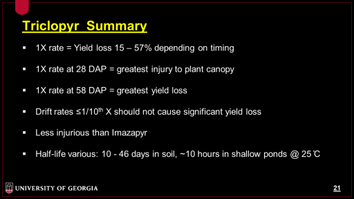 Triclopyr  Summary<BR>1X rate = Yield loss 15 – 57% depending on timing <BR> <BR>1X rate at 28 DAP = greatest injury to plant canopy <BR> <BR>1X rate at 58 DAP = greatest yield loss <BR> <BR>Drift rates =1/10th X should not cause significant yield loss <BR> <BR>Less injurious than Imazapyr <BR> <BR>Half-life various: 10 - 46 days in soil, ~10 hours in shallow ponds @ 25 °C <BR> <BR> <BR>