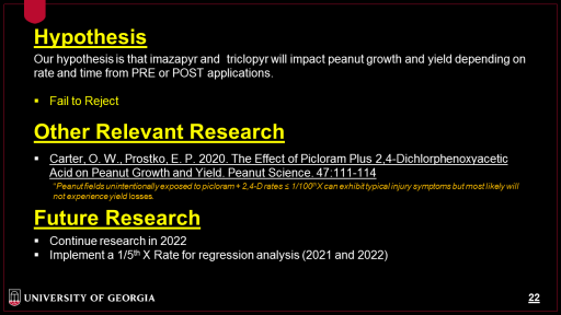 Other Relevant Research<BR>Carter, O. W., Prostko, E. P. 2020. The Effect of Picloram Plus 2,4-Dichlorphenoxyacetic Acid on Peanut Growth and Yield. Peanut Science. 47:111-114 <BR> <BR> <BR> <BR> <BR> <BR> <BR>Future Research<BR>Continue research in 2022 <BR>Implement a 1/5th X Rate for regression analysis (2021 and 2022) <BR> <BR> <BR>Hypothesis<BR>Our hypothesis is that imazapyr and  triclopyr will impact peanut growth and yield depending on rate and time from PRE or POST applications. <BR> <BR>Fail to Reject <BR> <BR>“Peanut fields unintentionally exposed to picloram + 2,4-D rates = 1/100thX can exhibit typical injury symptoms but most likely will not experience yield losses.  <BR>