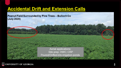 Accidental Drift and Extension Calls<BR>Peanut Field Surrounded by Pine Trees – Bulloch Co? <BR>(July 2020)? <BR>Aerial applications: <BR> Site prep; HWC; CRP <BR>Poured/Drifted into irrigation ponds<BR>