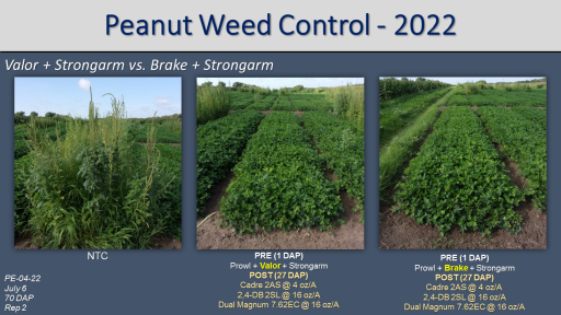 Peanut Weed Control - 2022<BR>PE-04-22 <BR>July 6 <BR>70 DAP <BR>Rep 2<BR>NTC<BR>Valor + Strongarm vs. Brake + Strongarm<BR>PRE (1 DAP) <BR>Prowl + Valor + Strongarm <BR>POST (27 DAP) <BR>Cadre 2AS @ 4 oz/A  <BR>2,4-DB 2SL @ 16 oz/A <BR>Dual Magnum 7.62EC @ 16 oz/A <BR>PRE (1 DAP) <BR>Prowl + Brake + Strongarm <BR>POST (27 DAP) <BR>Cadre 2AS @ 4 oz/A  <BR>2,4-DB 2SL @ 16 oz/A <BR>Dual Magnum 7.62EC @ 16 oz/A <BR>