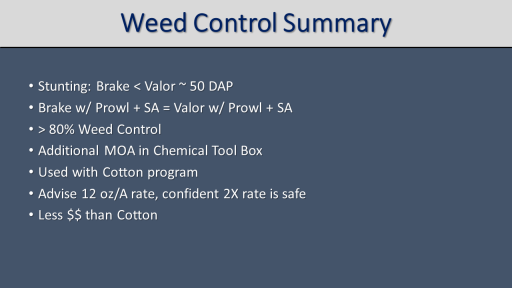 Weed Control Summary<BR>Stunting: Brake < Valor ~ 50 DAP <BR>Brake w/ Prowl + SA = Valor w/ Prowl + SA <BR>> 80% Weed Control <BR>Additional MOA in Chemical Tool Box <BR>Used with Cotton program <BR>Advise 12 oz/A rate, confident 2X rate is safe <BR>Less $$ than Cotton<BR>