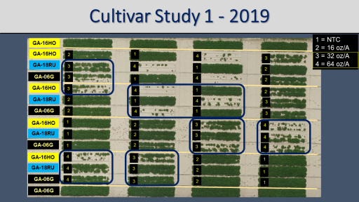 Cultivar Study 1 - 2019<BR>GA-18RU<BR>GA-16HO<BR>GA-18RU<BR>GA-18RU<BR>GA-18RU<BR>GA-16HO<BR>GA-16HO<BR>GA-16HO<BR>GA-16HO<BR>4<BR>3<BR>1<BR>2<BR>GA-06G<BR>GA-06G<BR>GA-06G<BR>GA-06G<BR>GA-06G<BR>1 = NTC <BR>2 = 16 oz/A <BR>3 = 32 oz/A <BR>4 = 64 oz/A<BR>