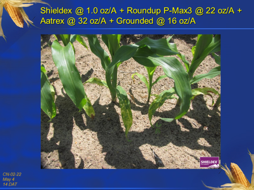 Shieldex @ 1.0 oz/A + Roundup P-Max3 @ 22 oz/A + Aatrex @ 32 oz/A + Grounded @ 16 oz/A<BR>CN-02-22 <BR>May 4 <BR>14 DAT<BR>