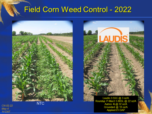 Field Corn Weed Control - 2022<BR>CN-02-22 <BR>May 4 <BR>14 DAT<BR>NTC<BR>Laudis 3.5SC @ 3 oz/A <BR>Roundup P-Max3 5.88SL @ 22 oz/A <BR>Aatrex 4L@ 32 oz/A <BR>Grounded @ 16 oz/A <BR>Applied 23 DAP<BR>