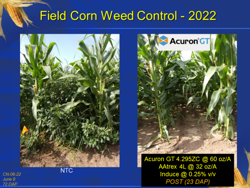 Field Corn Weed Control - 2022<BR>CN-06-22 <BR>June 8 <BR>72 DAP<BR>NTC<BR>Acuron GT 4.295ZC @ 60 oz/A <BR>AAtrex 4L @ 32 oz/A <BR>Induce @ 0.25% v/v <BR>POST (23 DAP)<BR>