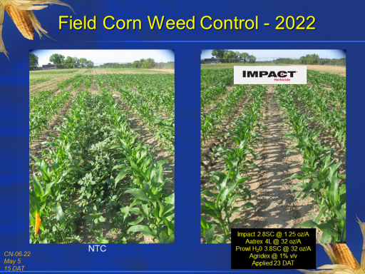 Field Corn Weed Control - 2022<BR>CN-06-22 <BR>May 5 <BR>15 DAT<BR>NTC<BR>Impact 2.8SC @ 1.25 oz/A <BR>Aatrex 4L @ 32 oz/A <BR>Prowl H20 3.8SC @ 32 oz/A <BR>Agridex @ 1% v/v <BR>Applied 23 DAT<BR>