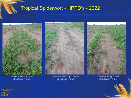 Tropical Spiderwort - HPPD’s - 2022<BR>TSW-01-22 <BR>August 17 <BR>22 DAT<BR>Laudis 3.5SC @ 3 oz/A <BR>Agridex @ 1% v/v<BR>Impact 2.87SC @ 1.25 oz/A <BR>Agridex @ 1% v/v<BR>Callisto 4SC @ 3 oz/A <BR>Agridex @ 1% v/v<BR>