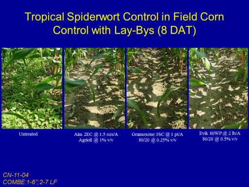Tropical Spiderwort Control in Field Corn Control with Lay-Bys (8 DAT)<BR>Untreated<BR>Aim 2EC @ 1.5 ozs/A <BR>Agrioil @ 1% v/v<BR>Gramoxone 3SC @ 1 pt/A <BR>80/20 @ 0.25% v/v<BR>Evik 80WP @ 2 lb/A <BR>80/20 @ 0.5% v/v<BR>CN-11-04 <BR>COMBE:1-6”; 2-7 LF<BR>