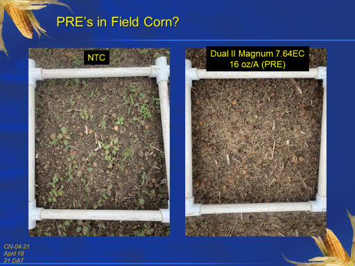 PRE’s in Field Corn?<BR>CN-04-21 <BR>April 18 <BR>21 DAT<BR>NTC<BR>Dual II Magnum 7.64EC <BR>16 oz/A (PRE)<BR>