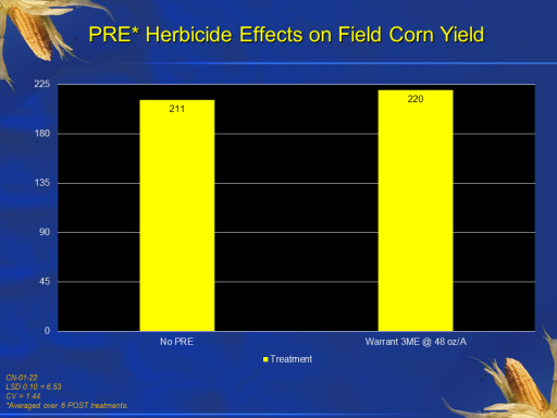 PRE* Herbicide Effects on Field Corn Yield<BR>CN-01-22 <BR>LSD 0.10 = 6.53 <BR>CV = 1.44 <BR>*Averaged over 6 POST treatments. <BR>