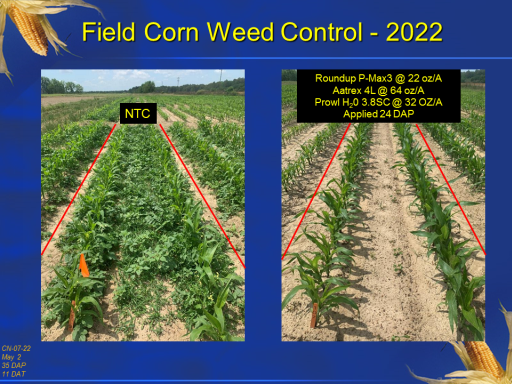 Field Corn Weed Control - 2022<BR>CN-07-22 <BR>May 2 <BR>35 DAP <BR>11 DAT<BR>NTC<BR>Roundup P-Max3 @ 22 oz/A <BR>Aatrex 4L @ 64 oz/A <BR>Prowl H20 3.8SC @ 32 OZ/A <BR>Applied 24 DAP<BR>