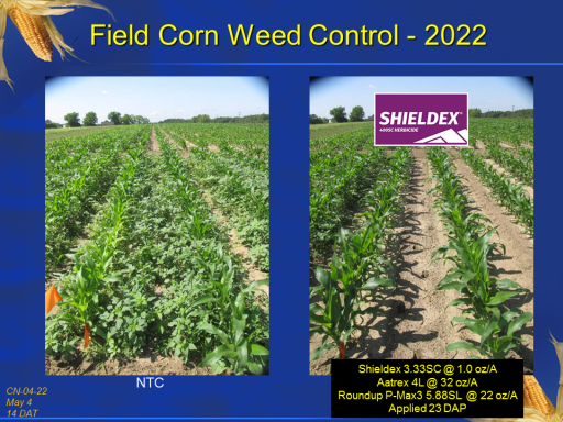 Field Corn Weed Control - 2022<BR>CN-04-22 <BR>May 4 <BR>14 DAT<BR>NTC<BR>Shieldex 3.33SC @ 1.0 oz/A <BR>Aatrex 4L @ 32 oz/A <BR>Roundup P-Max3 5.88SL  @ 22 oz/A <BR>Applied 23 DAP<BR>