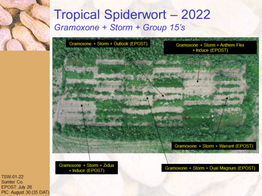 Tropical Spiderwort – 2022 Gramoxone + Storm + Group 15’s<BR>TSW-01-22 <BR>Sumter Co. <BR>EPOST: July 26 <BR>PIC: August 30 (35 DAT)<BR>Gramoxone + Storm + Dual Magnum (EPOST)<BR>Gramoxone + Storm + Outlook (EPOST)<BR>Gramoxone + Storm + Anthem Flex <BR>+ Induce (EPOST)<BR>Gramoxone + Storm + Zidua  <BR>+ Induce (EPOST)<BR>Gramoxone + Storm + Warrant (EPOST)<BR>