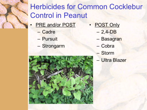 Herbicides for Common Cocklebur Control in Peanut<BR>PRE and/or POST <BR>Cadre <BR>Pursuit <BR>Strongarm<BR>POST Only <BR>2,4-DB <BR>Basagran <BR>Cobra <BR>Storm  <BR>Ultra Blazer<BR>