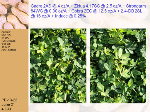 Cadre 2AS @ 4 oz/A + Zidua 4.17SC @ 2.5 oz/A + Strongarm 84WG @ 0.30 oz/A + Cobra 2EC @ 12.5 oz/A + 2,4-DB 2SL @ 16 oz/A + Induce @ 0.25% <BR>PE-13-22 <BR>June 21 <BR>4 DAT<BR>Applied: <BR>06/17/22 <BR>51 DAP <BR>R2-R3 stage <BR>6:55 am <BR>15 GPA <BR>AIXR nozzles<BR>