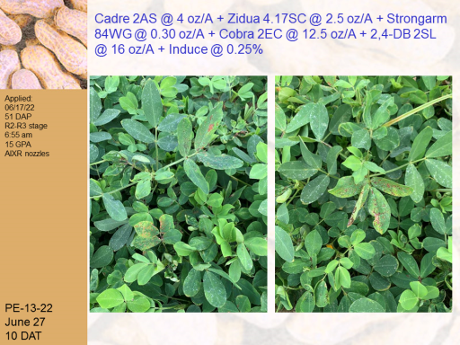 Cadre 2AS @ 4 oz/A + Zidua 4.17SC @ 2.5 oz/A + Strongarm 84WG @ 0.30 oz/A + Cobra 2EC @ 12.5 oz/A + 2,4-DB 2SL @ 16 oz/A + Induce @ 0.25% <BR>PE-13-22 <BR>June 27 <BR>10 DAT<BR>Applied: <BR>06/17/22 <BR>51 DAP <BR>R2-R3 stage <BR>6:55 am <BR>15 GPA <BR>AIXR nozzles<BR>