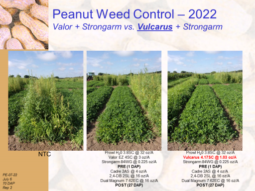 Peanut Weed Control – 2022 Valor + Strongarm vs. Vulcarus + Strongarm <BR>PE-07-22 <BR>July 6 <BR>70 DAP <BR>Rep 2<BR>NTC<BR>Prowl H20 3.8SC @ 32 oz/A <BR>Valor EZ 4SC @ 3 oz/A <BR>Strongarm 84WG @ 0.225 oz/A <BR>PRE (1 DAP) <BR>Cadre 2AS @ 4 oz/A  <BR>2,4-DB 2SL @ 16 oz/A <BR>Dual Magnum 7.62EC @ 16 oz/A <BR>POST (27 DAP) <BR>Prowl H20 3.8SC @ 32 oz/A <BR>Vulcarus 4.17SC @ 1.03 oz/A  <BR>Strongarm 84WG @ 0.225 oz/A <BR>PRE (1 DAP) <BR>Cadre 2AS @ 4 oz/A  <BR>2,4-DB 2SL @ 16 oz/A <BR>Dual Magnum 7.62EC @ 16 oz/A <BR>POST (27 DAP) <BR>