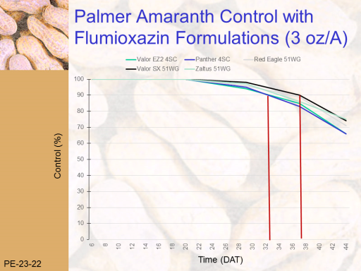 Palmer Amaranth Control with Flumioxazin Formulations (3 oz/A)<BR>PE-23-22<BR>Time (DAT)<BR>Control (%)<BR>