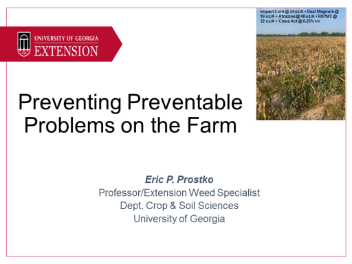 Eric P. Prostko <BR>Professor/Extension Weed Specialist  <BR>Dept. Crop & Soil Sciences <BR>University of Georgia <BR> <BR>Preventing Preventable Problems on the Farm<BR>Impact Core @ 24 oz/A + Dual Magnum @ 16 oz/A + Atrazine @ 48 oz/A + RUPM3 @ 32 oz/A + Class Act @ 0.25% v/v<BR>