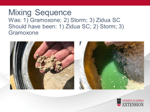 Mixing Sequence Was: 1) Gramoxone; 2) Storm; 3) Zidua SC Should have been: 1) Zidua SC; 2) Storm; 3) Gramoxone <BR>