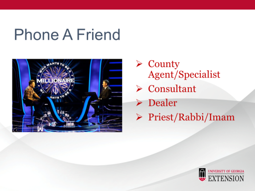 Phone A Friend<BR>County Agent/Specialist <BR>Consultant <BR>Dealer <BR>Priest/Rabbi/Imam<BR>