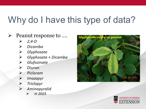 Why do I have this type of data?<BR>Peanut response to …. <BR>2,4-D <BR>Dicamba <BR>Glyphosate <BR>Glyphosate + Dicamba <BR>Glufosinate <BR>Diuron <BR>Picloram <BR>Imazapyr <BR>Triclopyr <BR>Aminopyralid <BR>In 2023 <BR>Glyphosate injury on peanut<BR>
