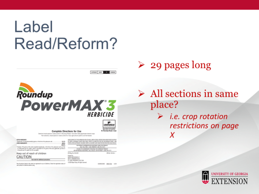 Label Read/Reform?<BR>29 pages long <BR> <BR>All sections in same place? <BR>i.e. crop rotation restrictions on page X <BR>