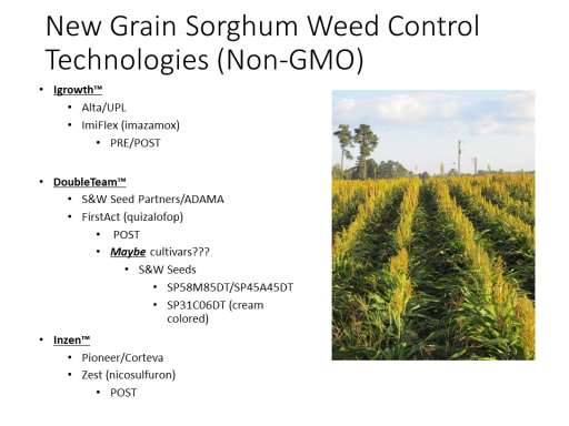 New Grain Sorghum Weed Control Technologies (Non-GMO)<BR>Igrowth™ <BR>Alta/UPL <BR>ImiFlex (imazamox) <BR>PRE/POST <BR> <BR>DoubleTeam™ <BR>S&W Seed Partners/ADAMA <BR>FirstAct (quizalofop) <BR> POST <BR>Maybe cultivars??? <BR>S&W Seeds <BR>SP58M85DT/SP45A45DT <BR>SP31C06DT (cream colored) <BR>Inzen™ <BR>Pioneer/Corteva <BR>Zest (nicosulfuron)  <BR>POST<BR>