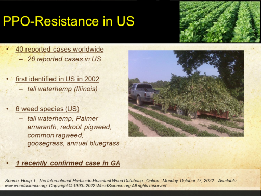 PPO-Resistance in US<BR>40 reported cases worldwide  <BR>26 reported cases in US <BR> <BR>first identified in US in 2002 <BR>tall waterhemp (Illinois)  <BR> <BR>6 weed species (US) <BR>tall waterhemp, Palmer amaranth, redroot pigweed, common ragweed, goosegrass, annual bluegrass <BR> <BR>1 recently confirmed case in GA<BR>Source: Heap, I.  The International Herbicide-Resistant Weed Database.  Online.  Monday. October 17, 2022 .  Available  www.weedscience.org Copyright © 1993- 2022 WeedScience.org All rights reserved. <BR>