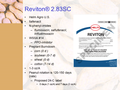 RevitonŽ 2.83SC<BR>Helm Agro U.S. <BR>tiafenacil <BR>N-phenyl-imides <BR>flumioxazin, saflufenacil, trifludimoxazin <BR>WSSA #14 <BR>PPO-inhibitor <BR>Preplant Burndown <BR>corn (0 d ) <BR>soybean (0-7 d) <BR>wheat (0 d) <BR>cotton (7-14 d) <BR>1-3 oz/A <BR>Peanut rotation is 120-150 days (rate) <BR>Proposed 24-C label <BR>0 days (1 oz/A) and 7 days (2 oz/A)<BR>