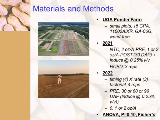 Materials and Methods<BR>UGA Ponder Farm <BR>small plots, 15 GPA, 11002AIXR, GA-06G, weed-free <BR>2021 <BR>NTC, 2 oz/A-PRE, 1 or 2 oz/A-POST (30 DAP) + Induce @ 0.25% v/v <BR>RCBD, 3 reps <BR>2022 <BR>timing (4) X rate (3) factorial, 4 reps <BR>PRE, 30 or 60 or 90 DAP (Induce @ 0.25% v/v)) <BR>0, 1 or 2 oz/A <BR>ANOVA, P=0.10, Fisher’s <BR>