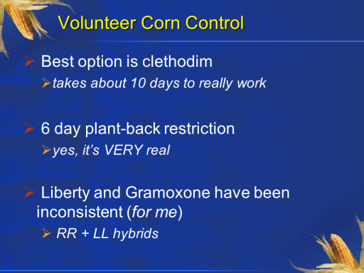 Volunteer Corn Control<BR> Best option is clethodim <BR>takes about 10 days to really work <BR> <BR> 6 day plant-back restriction  <BR>yes, it’s VERY real <BR> <BR> Liberty and Gramoxone have been inconsistent (for me) <BR> RR + LL hybrids<BR>