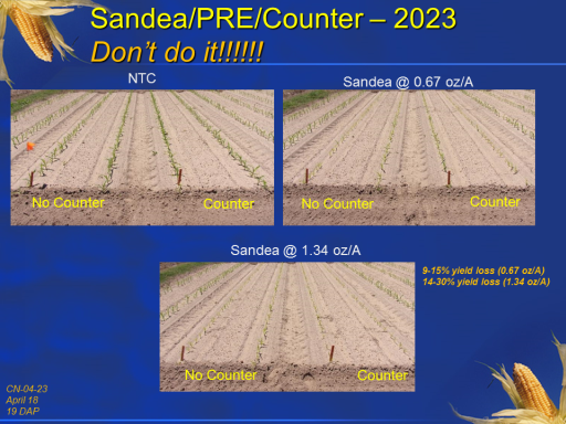 Sandea/PRE/Counter – 2023 Don’t do it!!!!!!<BR>CN-04-23 <BR>April 18 <BR>19 DAP<BR>NTC<BR>Sandea @ 0.67 oz/A<BR>Sandea @ 1.34 oz/A<BR>No Counter<BR>Counter<BR>9-15% yield loss (0.67 oz/A) <BR>14-30% yield loss (1.34 oz/A)<BR>
