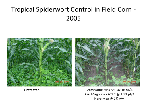 Tropical Spiderwort Control in Field Corn - 2005<BR>Untreated<BR>Gramoxone Max 3SC @ 16 oz/A <BR>Dual Magnum 7.62EC @ 1.33 pt/A <BR>Herbimax @ 1% v/v<BR>