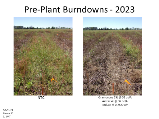 Pre-Plant Burndowns - 2023<BR>BD-01-23 <BR>March 30 <BR>21 DAT<BR>NTC<BR>Gramoxone 3SL @ 32 oz/A <BR>Aatrex 4L @ 32 oz/A <BR>Induce @ 0.25% v/v<BR>NTC<BR>