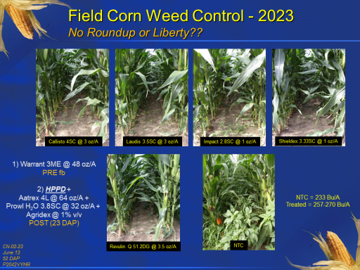 Field Corn Weed Control - 2023 No Roundup or Liberty??<BR>1) Warrant 3ME @ 48 oz/A <BR>PRE fb <BR> <BR>2) HPPD + <BR>Aatrex 4L @ 64 oz/A + <BR>Prowl H2O 3.8SC @ 32 oz/A +  <BR>Agridex @ 1% v/v <BR>POST (23 DAP) <BR>CN-02-23 <BR>June 13 <BR>52 DAP <BR>P2042VYHR<BR>Callisto 4SC @ 3 oz/A<BR>Laudis 3.5SC @ 3 oz/A<BR>Impact 2.8SC @ 1 oz/A<BR>Shieldex 3.33SC @ 1 oz/A<BR>Revulin Q 51.2DG @ 3.5 oz/A<BR>NTC<BR>NTC = 233 Bu/A <BR>Treated = 257-270 Bu/A<BR>