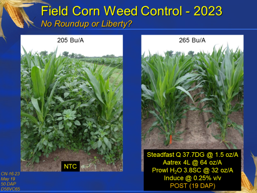 Field Corn Weed Control - 2023 No Roundup or Liberty?<BR>CN-16-23 <BR>May 19 <BR>50 DAP <BR>D58VC65<BR>NTC<BR>Steadfast Q 37.7DG @ 1.5 oz/A <BR>Aatrex 4L @ 64 oz/A <BR>Prowl H2O 3.8SC @ 32 oz/A <BR>Induce @ 0.25% v/v <BR>POST (19 DAP)<BR>205 Bu/A<BR>265 Bu/A<BR>