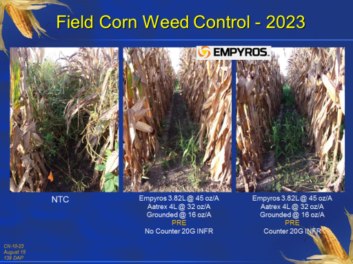 Field Corn Weed Control - 2023<BR>CN-10-23 <BR>August 15 <BR>139 DAP<BR>NTC<BR>Empyros 3.82L @ 45 oz/A <BR>Aatrex 4L @ 32 oz/A <BR>Grounded @ 16 oz/A <BR>PRE <BR>No Counter 20G INFR<BR>Empyros 3.82L @ 45 oz/A <BR>Aatrex 4L @ 32 oz/A <BR>Grounded @ 16 oz/A <BR>PRE <BR>Counter 20G INFR<BR>