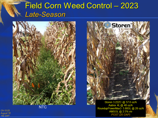 Field Corn Weed Control – 2023 Late-Season<BR>CN-12-23 <BR>August 18 <BR>150 DAP<BR>NTC<BR>Storen 3.22ZC @ 57.6 oz/A <BR>Aatrex 4L @ 48 oz/A <BR>RoundupPowerMax3 5.88SL @ 28 oz/A <BR>AMSOL @ 2.5% v/v <BR>POST (20 DAP)<BR>